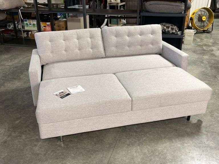 Condition Notes: Showroom floor model showing very light use with overall excellent condition. A few minor soil spots present from transportation and display, consistent with floor model status. Fabric shows minimal wear with no significant damage, tears, or structural issues. Conversion mechanism functions properly. Wood legs show minor scuffs consistent with floor display. Refer to the pictures and in person inspection for condition.