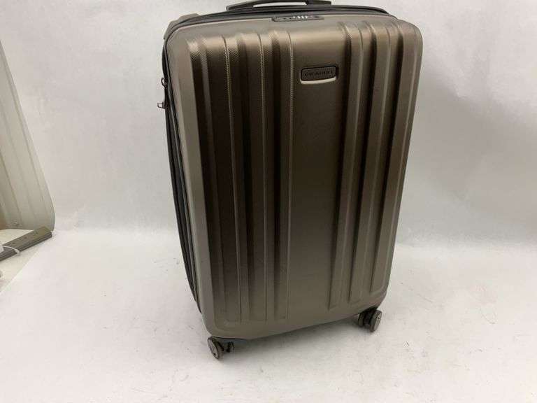 Ricardo Beverly Hills hard shell rolling suitcase in bronze color. Features interior organizational pockets and straps. The suitcase has four wheels and a retractable handle. Shows moderate use. Has crack on top side
