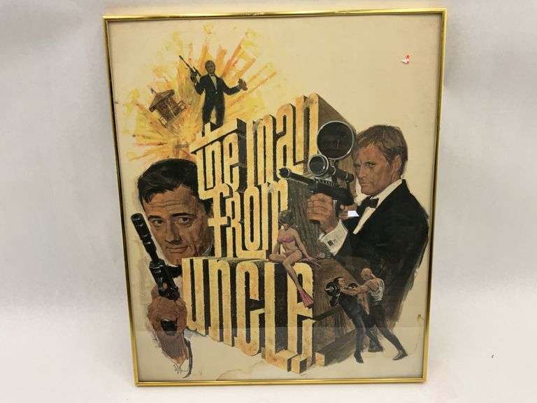 Framed print of "The Man From U.N.C.L.E.". Gold colored metal frame with wire hanging fixture attached. "That Frame Place" Sticker affixed to the back.