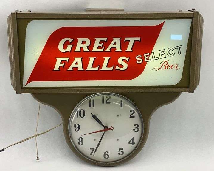 The lighted sign box contains backlit glass panel with Great Falls Select Beer branding in red pennant-style graphics on cream background. Metal frame construction finished in gold-tone paint houses both the clock mechanism and lighting system. Clock operates via electric motor with plug-in cord. Unit mounts to wall via rear bracket system.