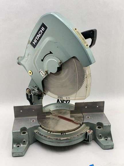 Die-cast aluminum and steel construction. Hitachi Koki model C15FB compound miter saw with 15-inch blade capacity. 115V AC, 15A motor rated at 3450 RPM. Features adjustable miter and bevel angles with graduated degree scale, locking handles, and integrated fence system. Dust collection port on blade guard. Extension wing supports included for longer stock. Double-insulated electrical system with trigger switch and lock-off safety. Bolt-down mounting holes in base. Manufactured in Japan, approximately 1990s-2000s.