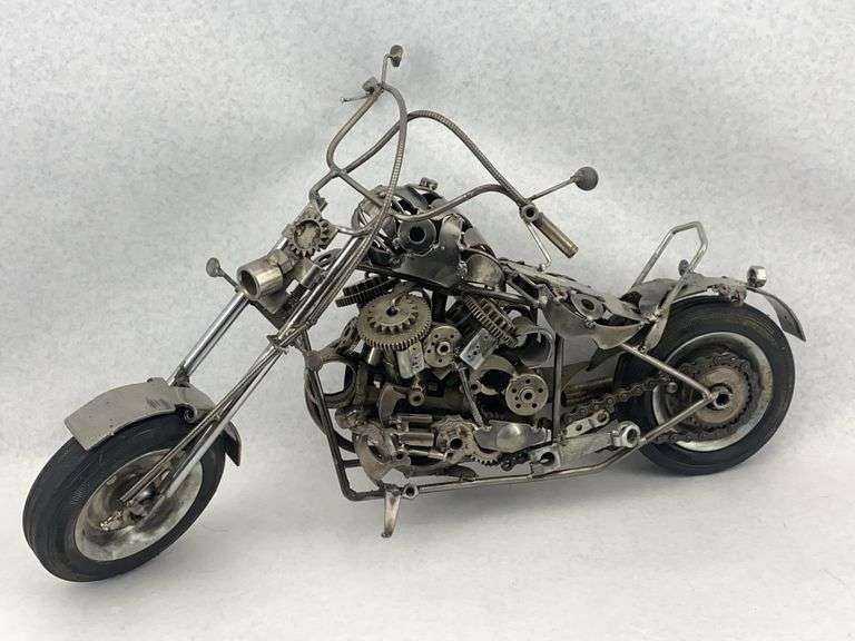 Motorcycle sculpture constructed from metal parts, featuring rubber tires. Dimensions are approximately 25 x 6 x 14 inches.