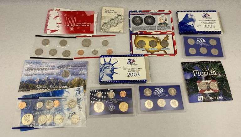 Collection of United States Mint proof and uncirculated coin sets. Includes various years and commemorative designs.