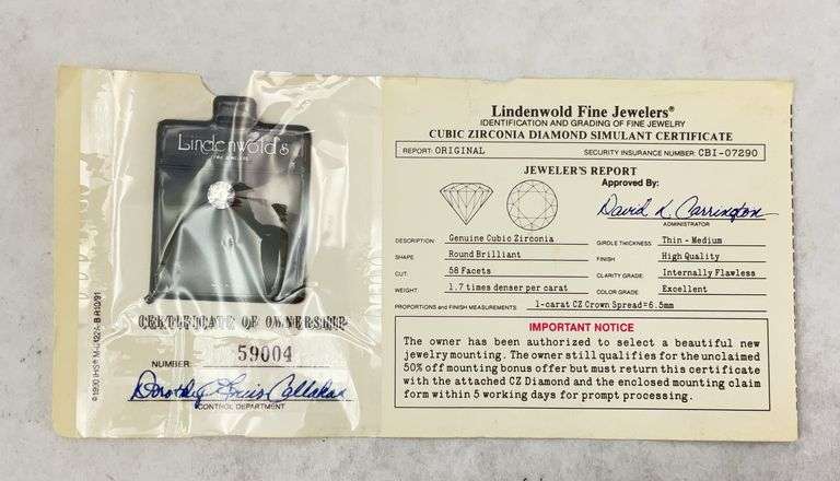 DescriptionThis lot features a Lindenwold Fine Jewelers Cubic Zirconia stone, accompanied by its original certificate of ownership and jeweler's report. The stone is a round brilliant cut with 58 facets, described as 1.7 times denser per carat. The certificate includes details about the stone's girdle thickness, finish, clarity grade, and color grade.