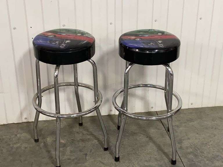 This is a set of two bar stools with a automotive theme, with an image of a motorcycle, car and pick up truck