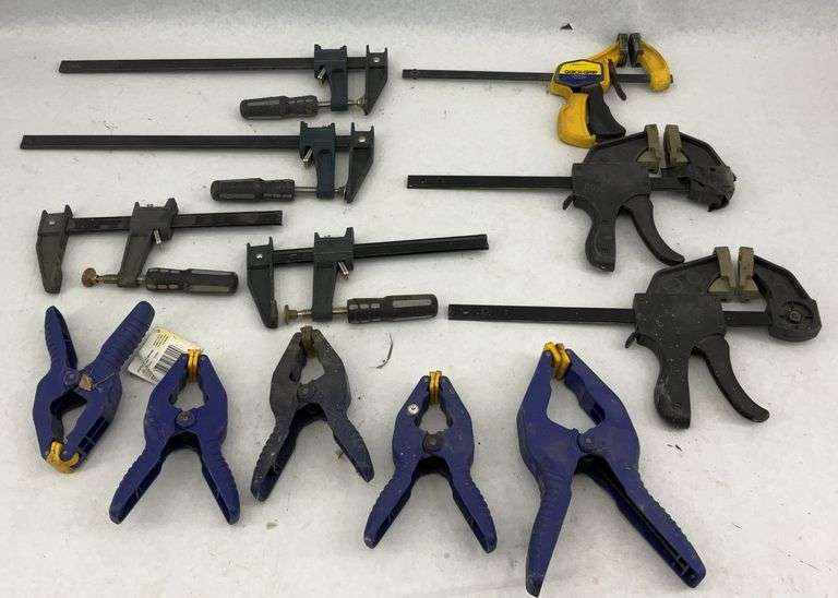 This lot features a variety of clamps including bar clamps, spring clamps, and other styles. Ideal for woodworking, construction, or general clamping needs.