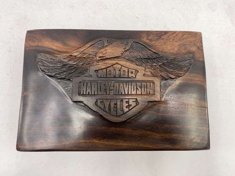 Solid hardwood construction, believed to be black walnut, featuring prominently carved Harley-Davidson Motor Cycles logo with eagle motif on hinged lid. The box exhibits rich dark wood grain patterns and natural figuring throughout the exterior surfaces. Fitted with brass barrel hinges securing the lid. Interior lined with black felt material providing protective storage surface. The carved relief design showcases the iconic Bar and Shield logo with spread eagle above, demonstrating skilled woodworking and attention to detail. Box construction appears to be solid wood panels joined at corners. Dense, heavy wood consistent with premium hardwood species. The piece serves as both functional storage and display of Harley-Davidson brand heritage. No maker's marks identified.