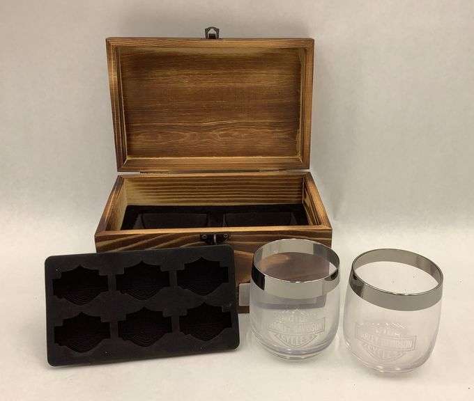 DescriptionHarley-Davidson barware set featuring two etched glasses and a branded wooden box, along with a silicone ice cube mold. The wooden box has a metal placard that reads "Big Sky Harley-Davidson" and features the Harley-Davidson logo on the top of the box. The box measures approximately 8 1/2x5 1/2x4 1/2.