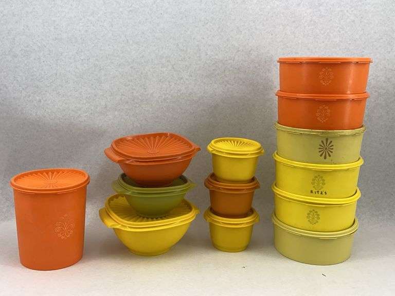 Collection of Tupperware containers in shades of orange, yellow, and green. A few will need cleaning.