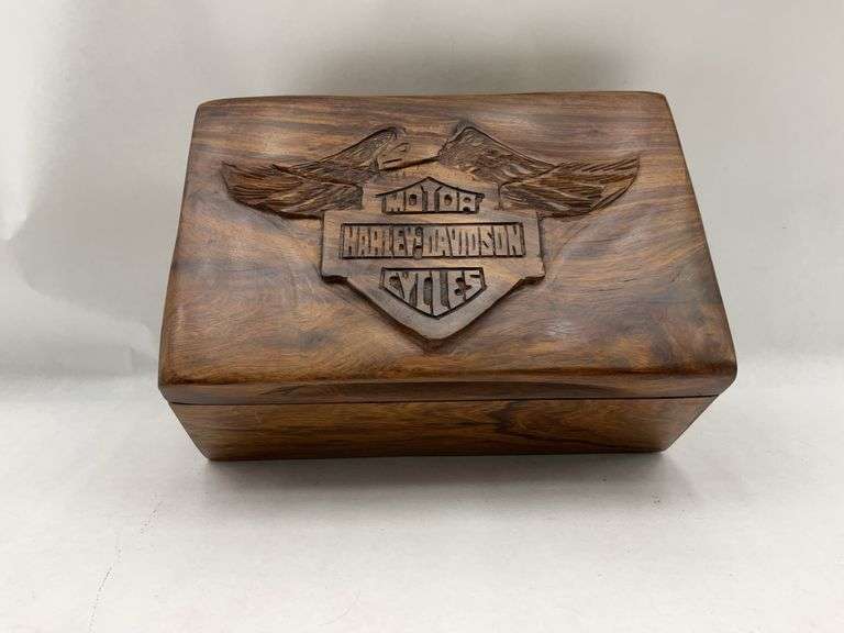 DescriptionSolid hardwood construction, believed to be black walnut, featuring prominently carved Harley-Davidson Motor Cycles logo with eagle motif on hinged lid. The box exhibits rich dark wood grain patterns and natural figuring throughout the exterior surfaces. Fitted with brass barrel hinges securing the lid. Interior lined with black felt material providing protective storage surface. The carved relief design showcases the iconic Bar and Shield logo with spread eagle above, demonstrating skilled woodworking and attention to detail. Box construction appears to be solid wood panels joined at corners. Dense, heavy wood consistent with premium hardwood species. The piece serves as both functional storage and display of Harley-Davidson brand heritage. No maker's marks identified.
