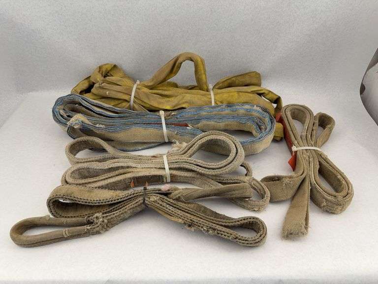 This listing includes a variety of used lifting straps. These fabric straps are of various lengths and widths, with loops on the ends for connection.