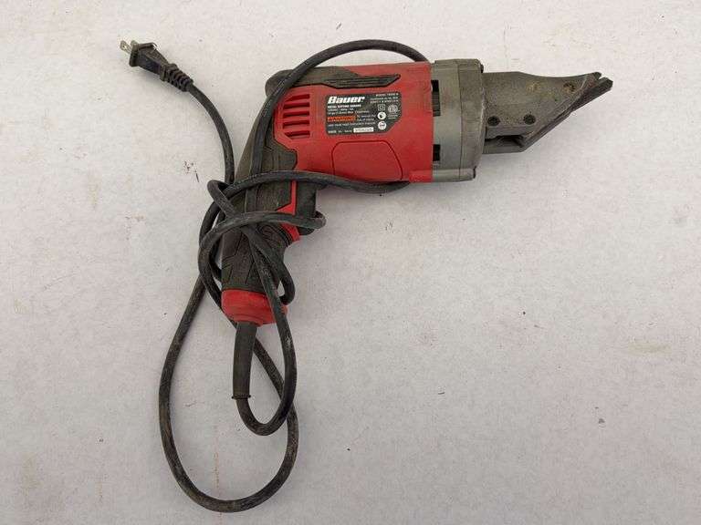 Bauer model 1826E-B metal cutting shears. 120VAC, 60Hz, 5A. 14 ga (1.9mm) Max. thickness.