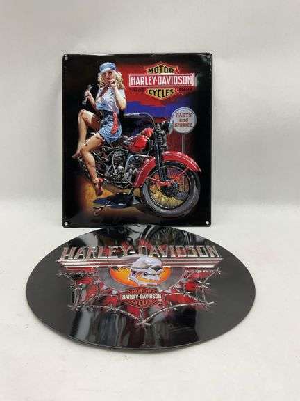 Two Harley-Davidson embossed metal signs. One is a square sign featuring a woman on a motorcycle with a 'Parts and Service' graphic. The other is a round sign with a Harley-Davidson logo and skull design.