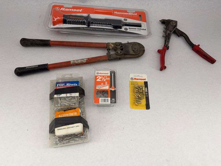 Includes a Ramset Hammer Shot tool, a rivet tool, a Ridgid bolt cutter, pop rivets, and other fasteners.