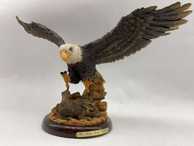 Figurine from The Gray Rock Collection depicting an eagle swooping down on a hare. It has a 19 1/2 inch wingspan, is 11 inches tall, and 9 inches wide. There are small chips and scuff marks.