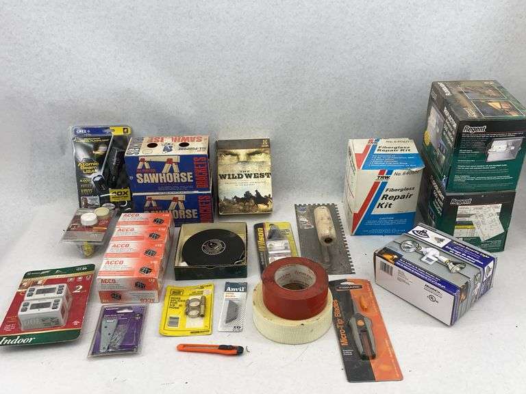 DescriptionThis mixed lot includes a variety of items such as sawhorse brackets, a TRW fiberglass repair kit, Regent 500 watt halogen floodlights, a Wild West DVD, ACCO medium binder clips, a Wilson mirror mount, Anvil utility blades, and other miscellaneous tools and hardware.