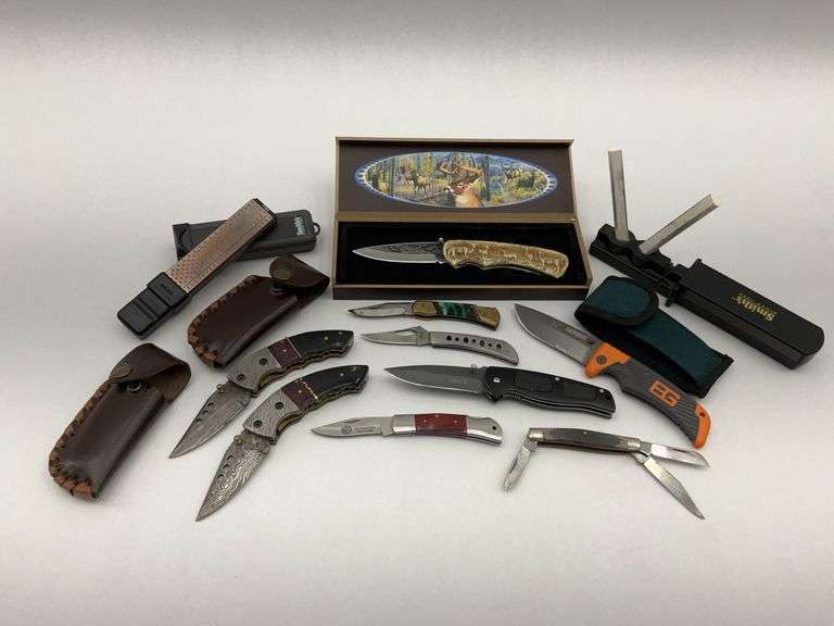 DescriptionThis lot features a variety of folding knives, including a Black SWAT2 (7 inches), an orange Gerber (7.25 inches), a mini silver (6 inches), a mini silver with red handle (6.5 inches), a curved black, red, and silver knife (7.5 inches), an Old Timer (2.5 inches), a mini with camo (2.5 inches), and a Buck knife in its original box (8 inches). This lot also includes two knife sharpeners.