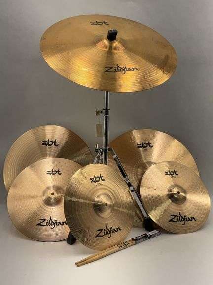 This listing includes a set of Zildjian ZBT cymbals, featuring a ride cymbal, hi-hat cymbals, and crash cymbals. Also included is a cymbal stand and a pair of drumsticks. The cymbals are Zildjian ZBT series.