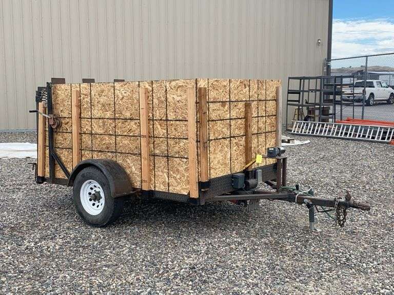 Utility trailer featuring wood side panels and a heavy-duty drop-down tailgate measuring 52" x 68". The inside bed dimensions are 106 inches long and 68 inches wide. This trailer takes a 2-inch ball. It was originally a tilt trailer, but the drop ramp was added. The trailer would still function as a tilt trailer if the ramp were removed.