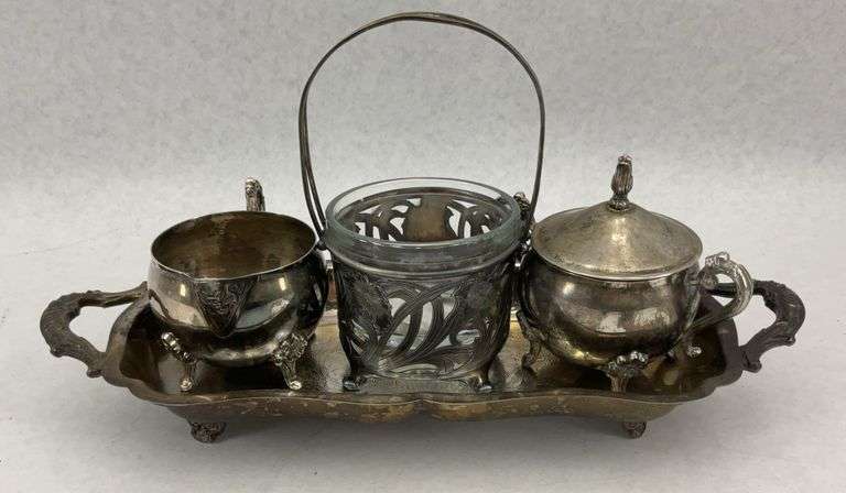 DescriptionThis set includes a silverplated tray, a jelly holder with a glass insert, a creamer, and a sugar bowl with a lid. The jelly holder has an Art Deco style openwork design. The set includes markings from International Silver Co. and St. Louis Silver Plate Co.