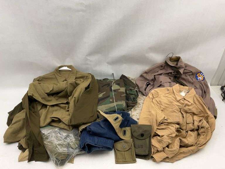This lot includes an assortment of military clothing items. You'll find various shirts, pants, and pouches, perfect for collectors, reenactors, or those interested in military apparel.