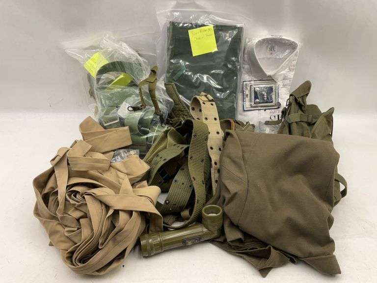 This lot includes a variety of military field gear and accessories, such as belts, straps, bags, pouches, a flashlight, and uniform components. Ideal for collectors, enthusiasts, or reenactors.
