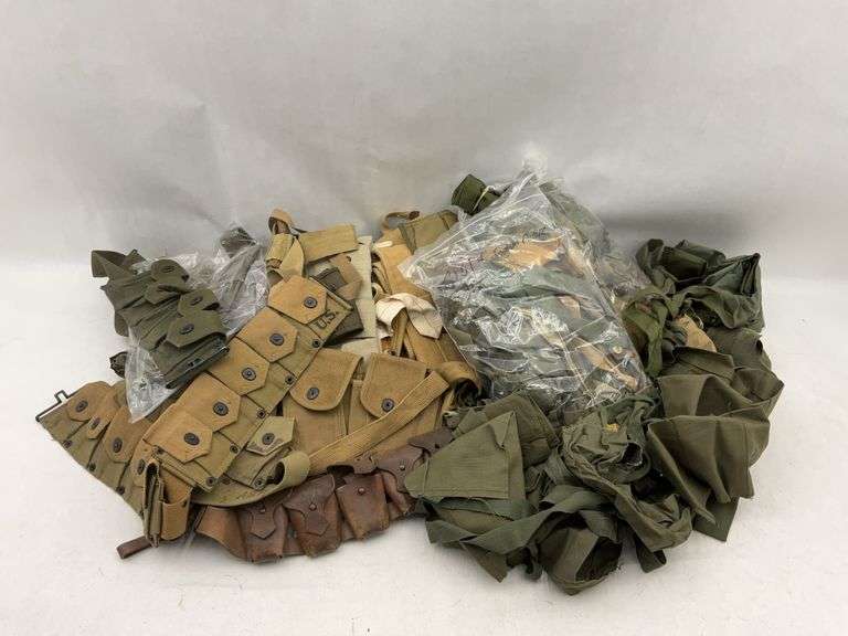 Large assortment of military pouches, straps, and webbing. Includes multiple types and colors.