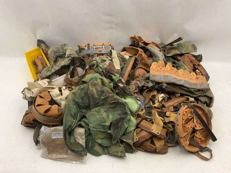 This lot includes a variety of military helmet components, liners, straps, and camouflage covers. A great addition to a military memorabilia collection.