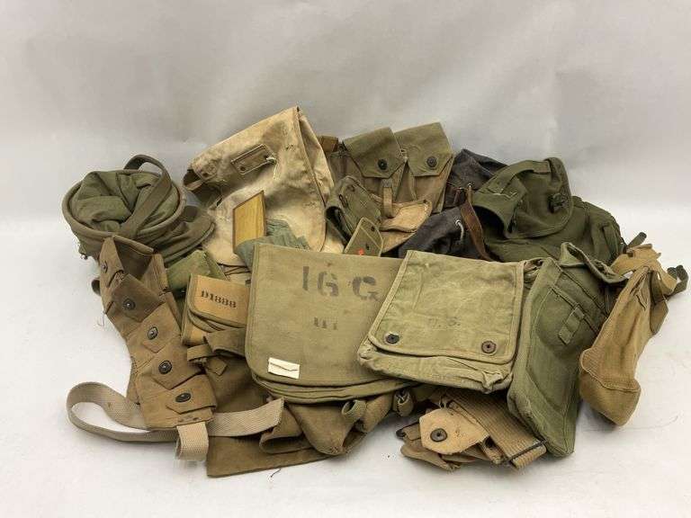 Collection of various military-style canvas bags, pouches, and straps. Includes a range of sizes and designs in different shades of khaki and green. Some items have markings.
