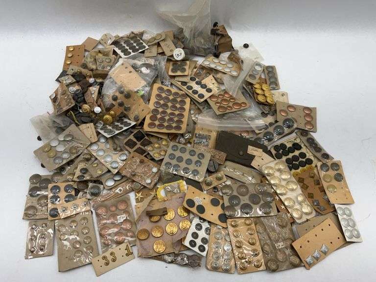 DescriptionThis is a large assortment of buttons, many still on their original cards. The buttons feature various designs, including those with naval anchors, military emblems, decorative patterns, and more. These buttons would be great for crafters, collectors, or anyone interested in unique and interesting fasteners.