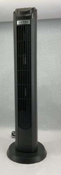 Sierra tower fan. Features include timer settings and multiple speed options. Shows light use, no remote