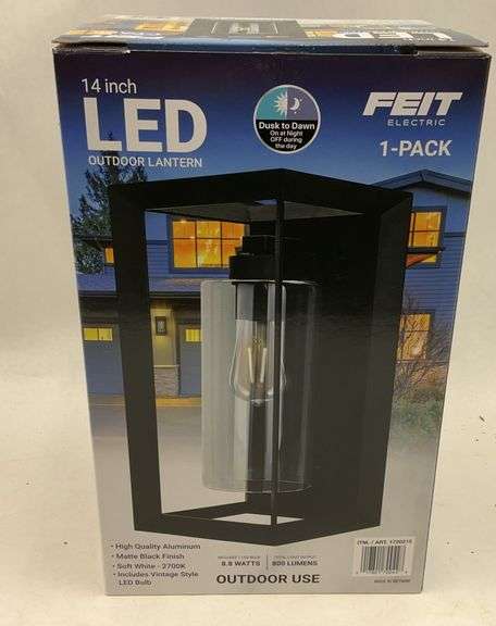 Feit Electric 14 inch LED Outdoor Lantern with Dusk to Dawn. High Quality Aluminum with Matte Black Finish. Soft White-2700K. Includes Vintage Style LED Bulb. New