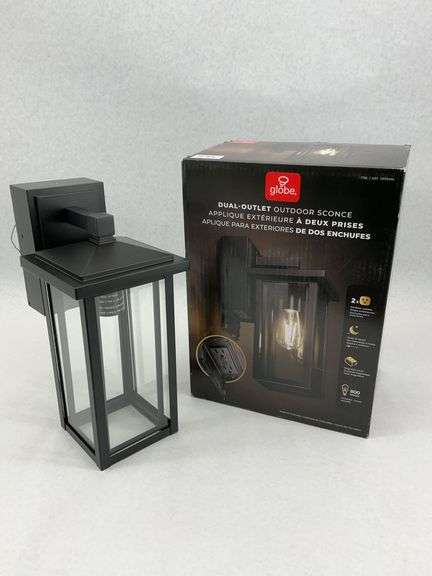 New in box Globe dual-outlet outdoor sconce. Dusk to dawn option, integrated outdoor outlets with magnetic hinged cover, and includes LED bulb.