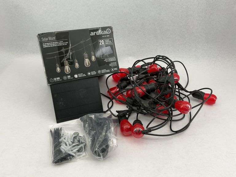 Artika Solar Blaze 20 LED Bulb String Lights. Model OUT-BZSO-C2BL. Dimensions of the box are 20x34x30. There are scratches on top as shown. Light use.