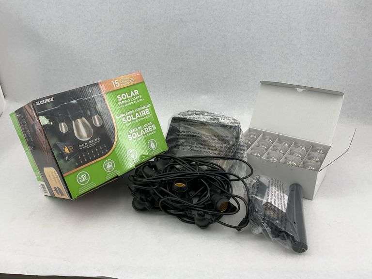 Sunforce solar string lights with remote control. Features 15 LED bulbs and a 35 foot length. The box has sun discoloration.