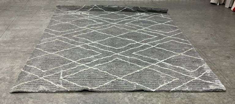 Soft-Step Microfiber shag rug measuring 7ft 10in x 10ft (238cm x 304cm). The rug is gray with a white diamond pattern. Used with moderate wear.