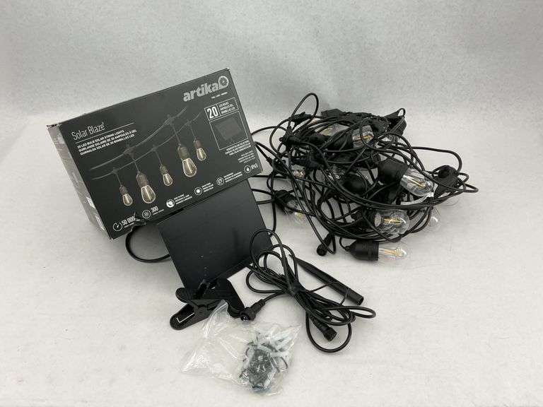 New Solar Blaze Artika 20 LED Bulb Solar String Lights. Slight damage to bottom edge of box and top edge due to prior opening. Not tested