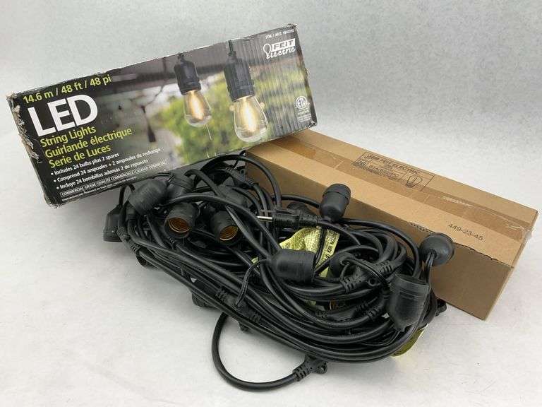 Feit Electric 48 ft LED String Lights, includes 24 bulbs and 2 spares. Box has slight damage on sides and from prior opening.