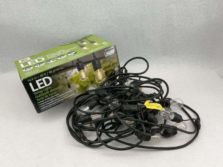Feit Electric 14.6 m / 48 ft LED string lights. Includes 24 bulbs + 3 spares. Slight damage to sides of box from prior opening.