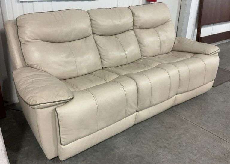 The leather upholstery shows moderate wear throughout, including darkening and discoloration visible on the seat cushions and contact areas. Surface wear is apparent on multiple panels, particularly in high-use areas such as the center seat and armrests. The leather exhibits general surface soiling and use marks consistent with normal use. Minor scuffing visible along seams and edges. Functionality of power reclining mechanisms . as been verified. Refer to the pictures and in person inspection for condition.