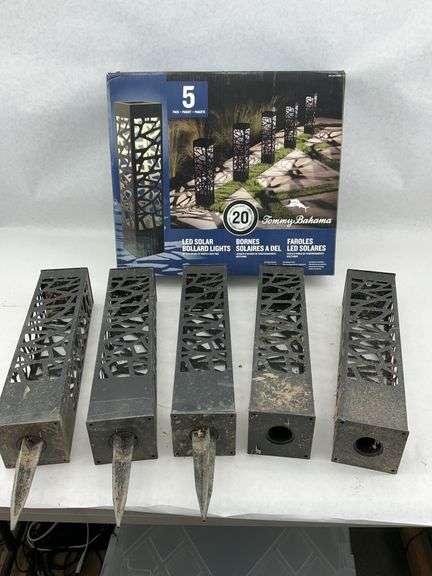 Tommy Bahama LED Solar Bollard Lights - 5 Pack. Used and box has rip in the lid. Missing 2 mounting stakes.