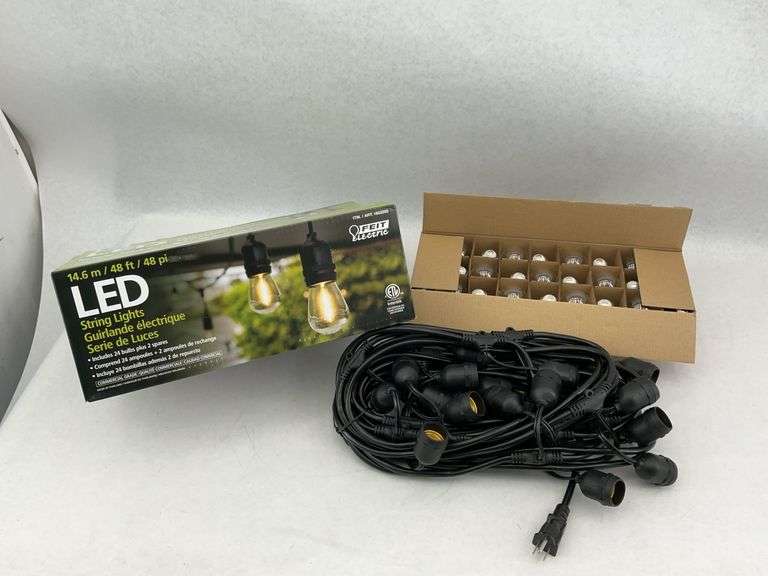 Feit Electric 48ft LED String Lights with 26 clear S14/822/PC bulbs. Includes 24 bulbs plus 2 spares, heavy duty 16/3 cord. Tested/works. Little scuffs around box.