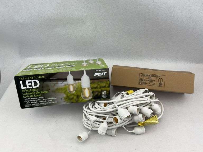 Feit Electric LED String Lights. 48 ft long. Includes 24 bulbs plus 2 spares. New and tested. Bulbs need to be screwed in very tight. Very little scuffs around box.