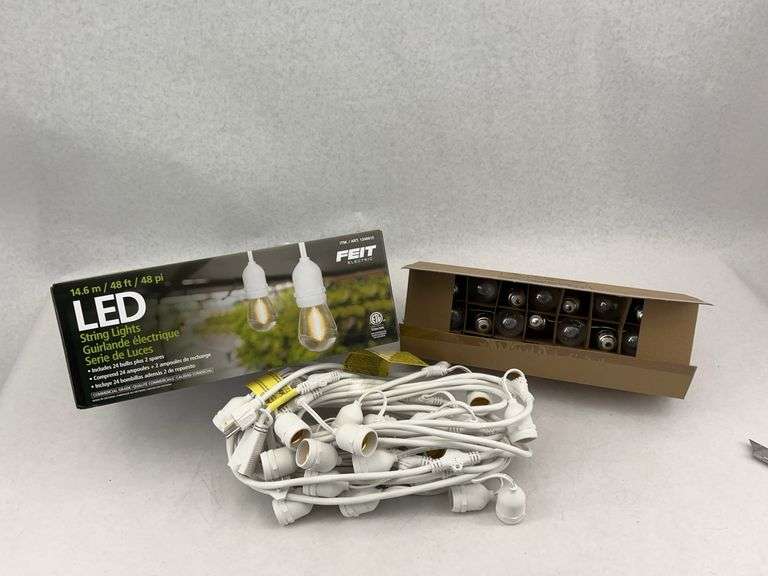 FEIT Electric LED String Lights. 14.6 m / 48 ft heavy-duty 16/3 cord. Includes 24 bulbs plus 2 spares. New and tested.