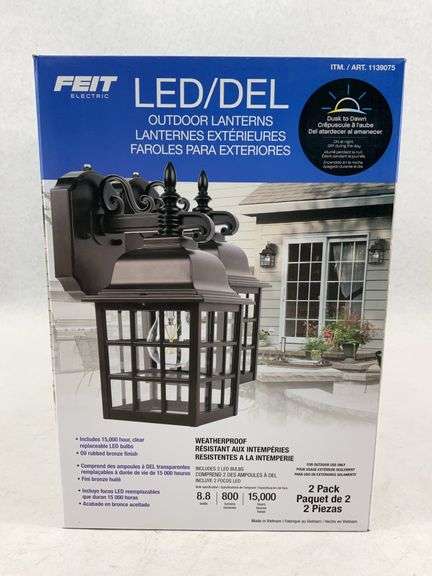 This lot incudes a pair of Feit outdoor lights. 15,000 hour, clear replaceable LED bulbs. Oil rubbed bronze finish. Weatherproof. New.