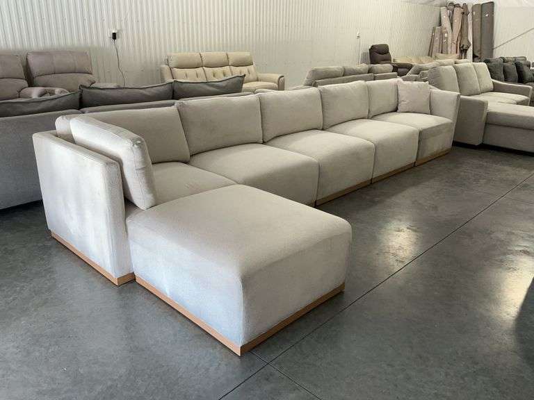 Contemporary modular sectional sofa manufactured by Henredon. This six-piece fabric sectional features a modular configuration allowing for versatile arrangement options. The set includes five seating modules and one ottoman/chaise component. Upholstered in a neutral cream-colored fabric with clean lines and minimalist design aesthetic. The base features exposed wood trim along the lower edge in a light natural finish. Cushions appear to be high-density foam construction with removable back pillows for easy maintenance. The modular design allows each piece to function independently or connect to create various seating configurations including L-shape or linear arrangements.