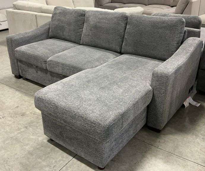 Showroom model with light display wear. Minor scuffing visible on upholstery consistent with showroom handling. Cushions show minimal compression from display use. Fabric exhibits slight flattening in high-traffic areas of seating surfaces. Storage mechanism operates smoothly. Electrical components and USB ports appear functional based on visual inspection. No tears, stains, or structural damage observed. Refer to the pictures and in person inspection for condition.
