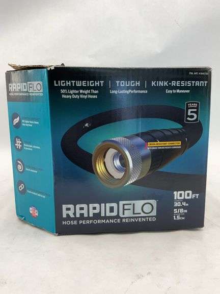 RapidFlo brand 100-foot garden hose with 5/8-inch diameter in original packaging, kink-resistant