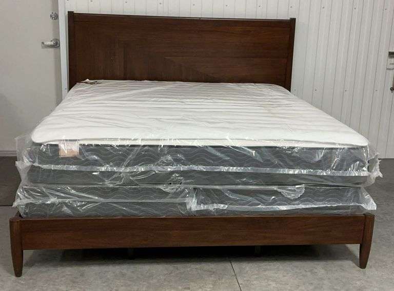 Solid wood construction with rich walnut-toned finish featuring clean mid-century modern lines. The bed frame showcases tapered legs, a flat panel headboard with book-matched veneer pattern, and low-profile footboard design. Contemporary platform-style construction with side rails and support system. Item number 1752674, model D-B275K-501R noted on manufacturer's tag. King size dimensions accommodate standard king mattress and box spring.