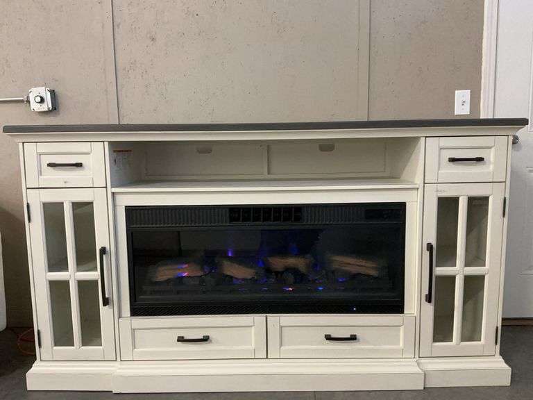 The piece shows minimal wear consistent with brief use. White painted surfaces display light scuffs and minor marks from handling. Gray top surface appears in good condition with no visible damage. All drawers and cabinet doors operate properly. Glass panels intact without chips or cracks. Electric fireplace insert functions as intended with operational LED flame effects. Manufacturer labels present and intact on interior surfaces.